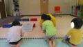マットコースター!! 順番に「マットコースター」に乗って、お友達に運んでもらいましょう・・乗るお友達が、だんだんと大きくなります。最後は「大きな大きな先生」でした。みんなで「重た~い!!」と叫びました。