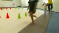 ハードルの上に1度乗って、ジャンプで飛び降りる練習をしたお友達。