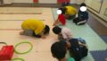 水色マットから、青色マットにいるお友達に、イスの下・ゴムの下を上手にボールを転がせるかなぁ・・・
