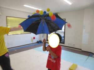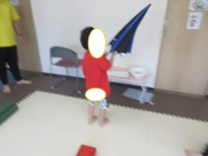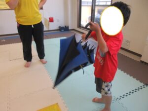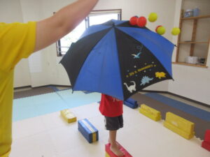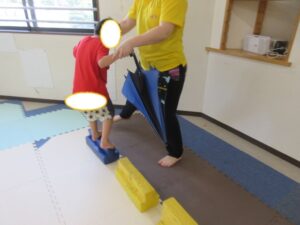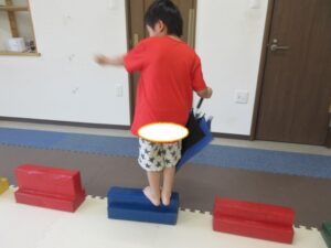 閉じた傘を持って今度は平均台をカニ歩きして戻ってきます✨