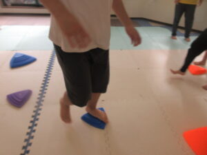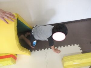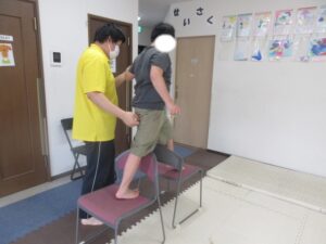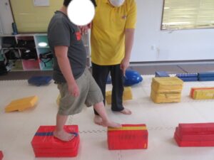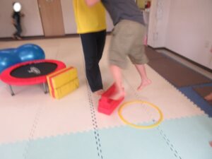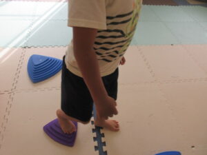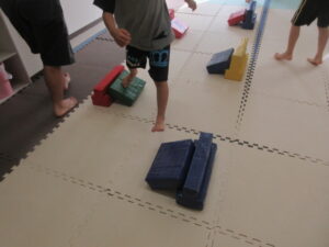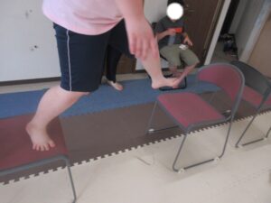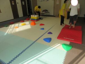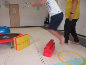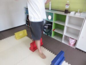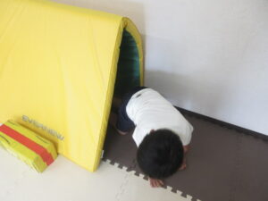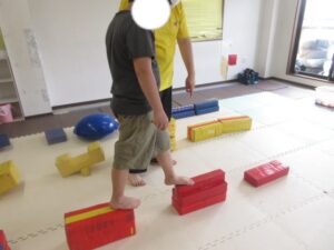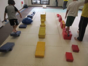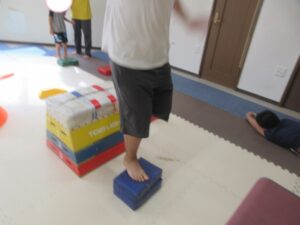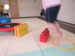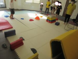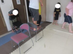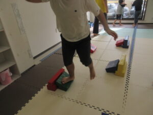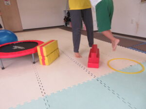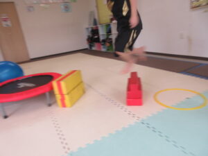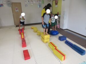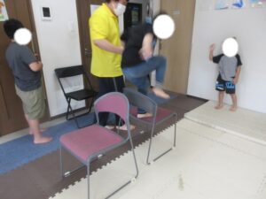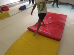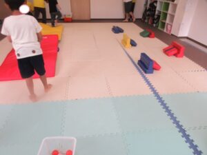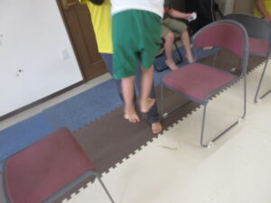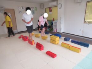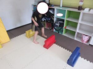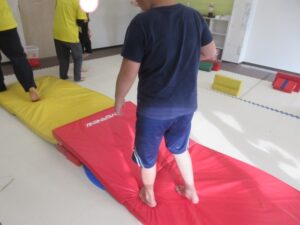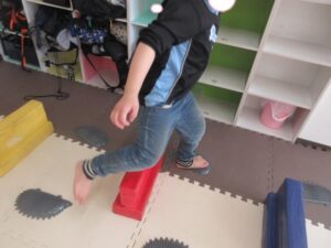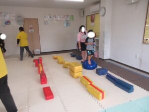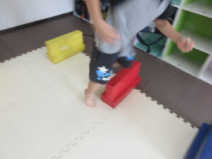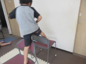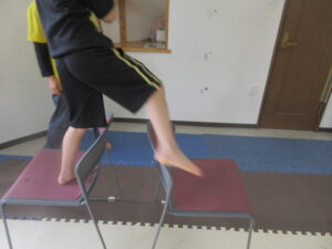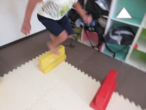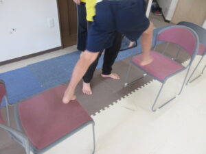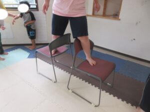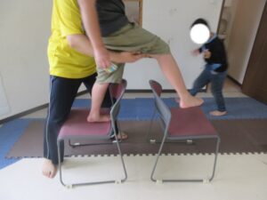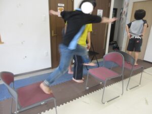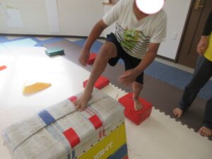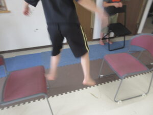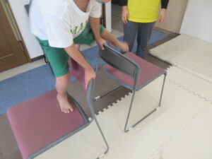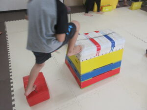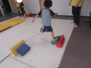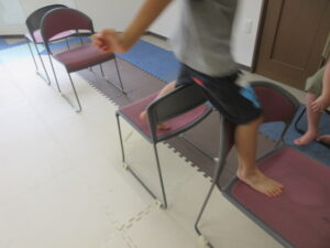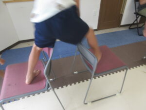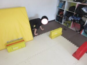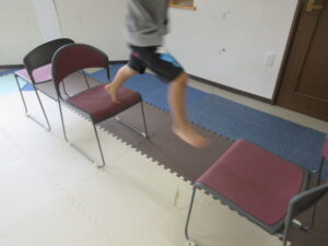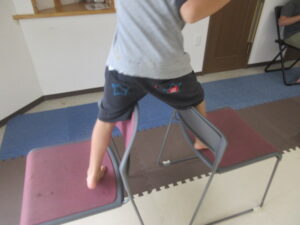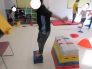 緑色の平均台からスタートして、跳び箱に登ったり、椅子に乗って跨いで進んだり、、、