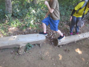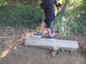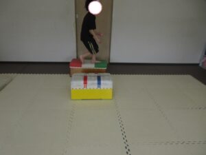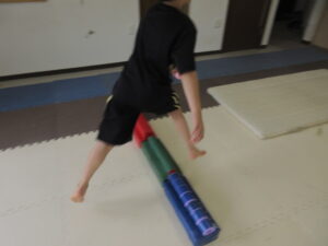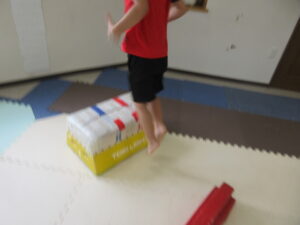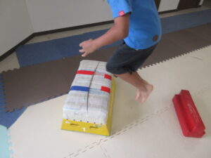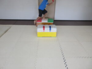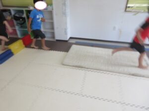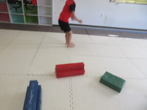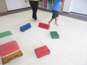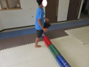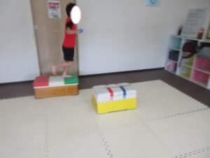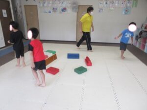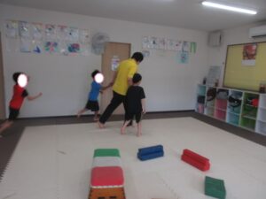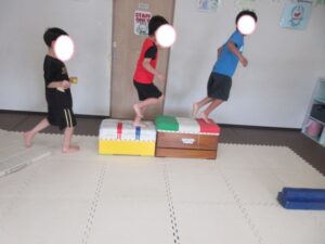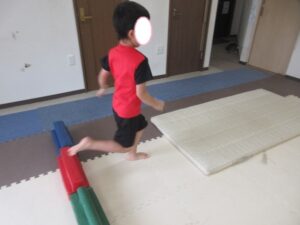 平均台を走って跨いで進みマットの上を走ったり、跳び箱の上を走ったり、