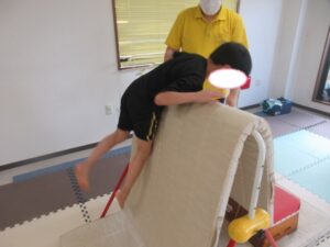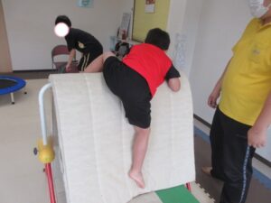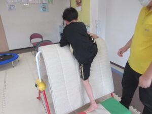 鉄棒に登ることがなかなか難しいお友達、怖かったお友達も、後半は自分で足を伸ばして