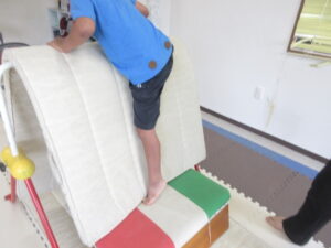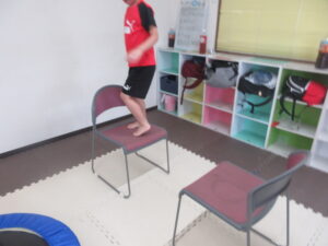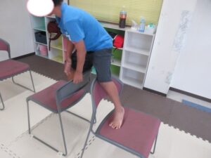 鉄棒によじ登って、降りたら椅子に乗って跨いで進もう(*’▽’)
