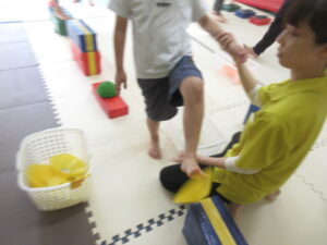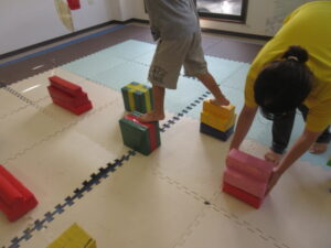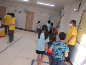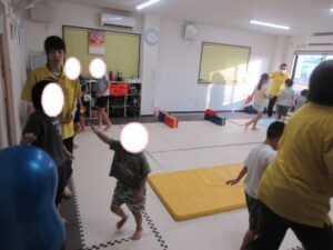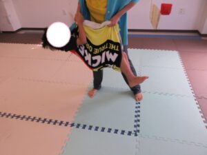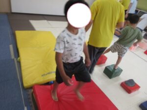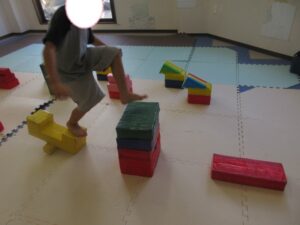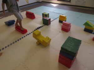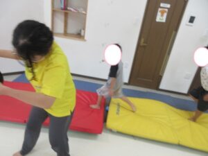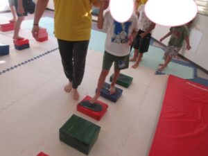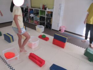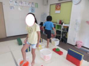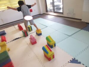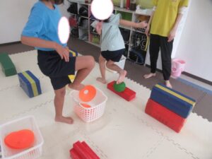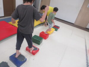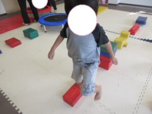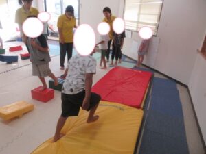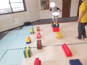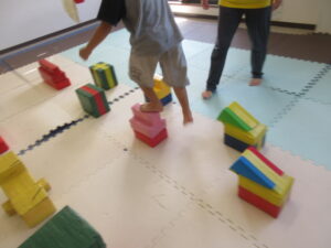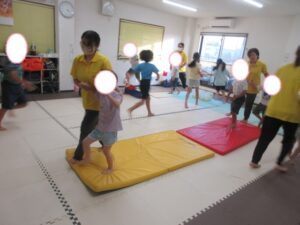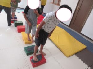 歩いてバランス歩きで進んで帰りは下に障害物が乗ったマットを進んでね✨