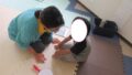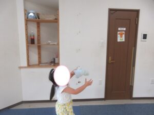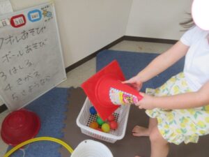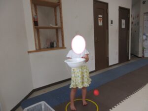 ボウルやカラーコーンなど色々な道具を使ってボールキャッチに挑戦しましたが