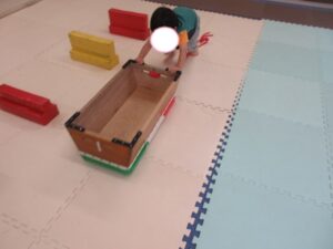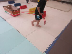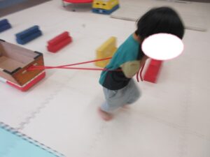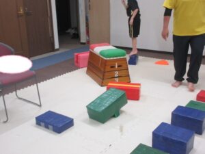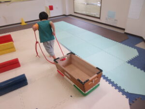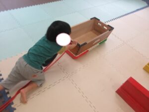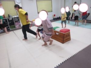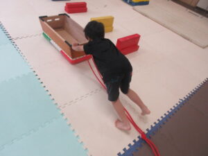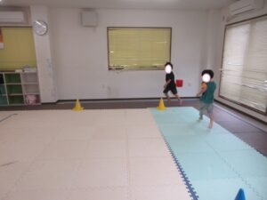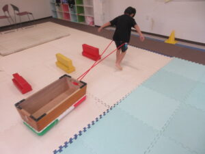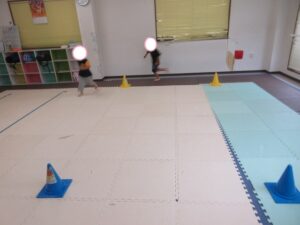 跳び箱を引っ張って黄色のコーンまで進み、帰りは押して次のお友達のところまで
