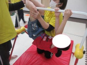 みんなでボールを運びながら鉄棒の下を潜ったり