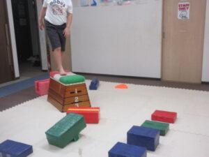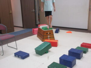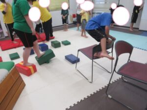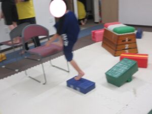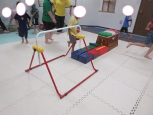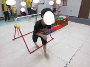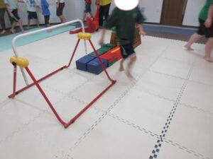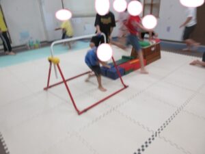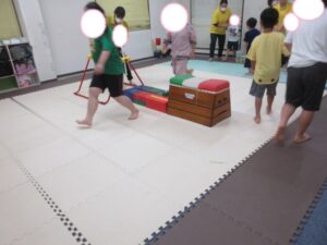 お友達に跳び箱を運んだら、平均台をグージャンプで進み、走って戻るよ!!