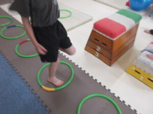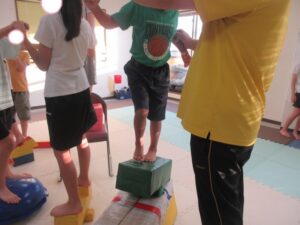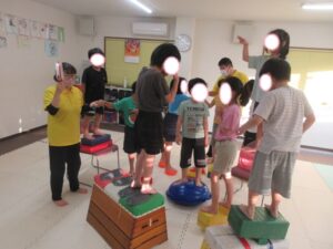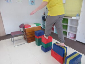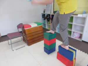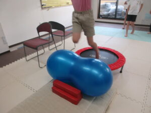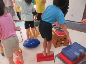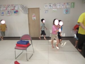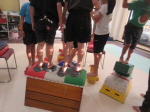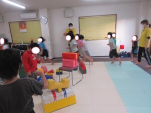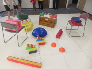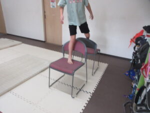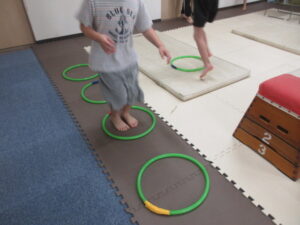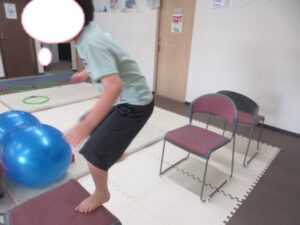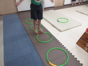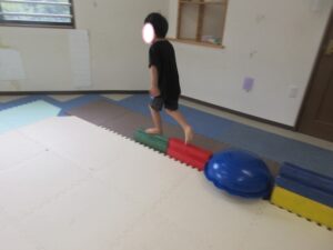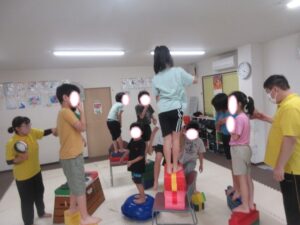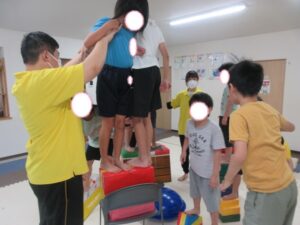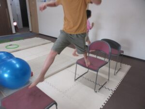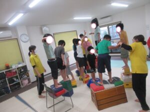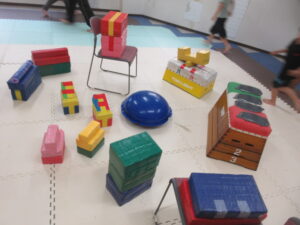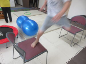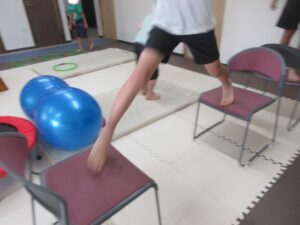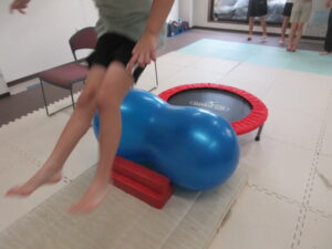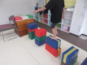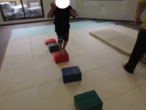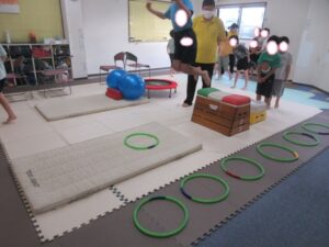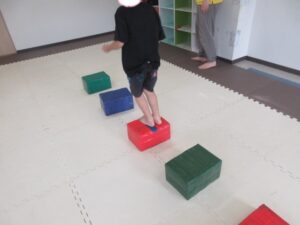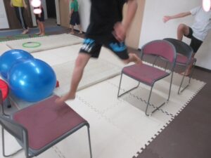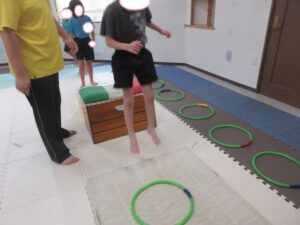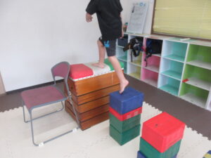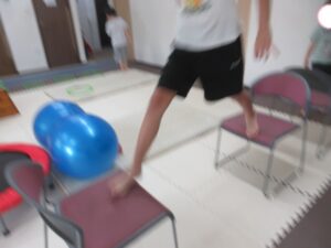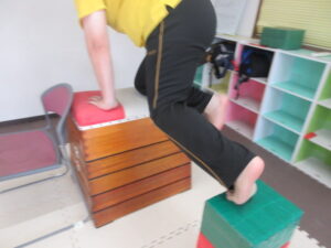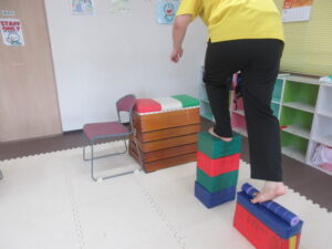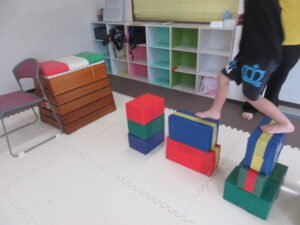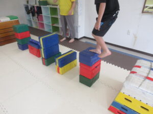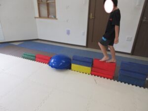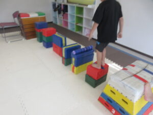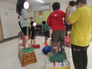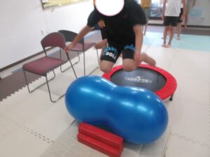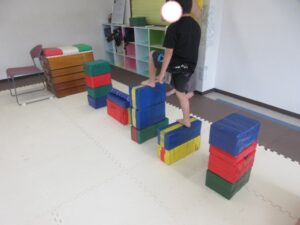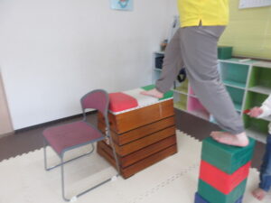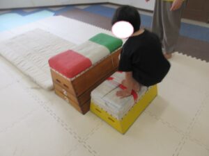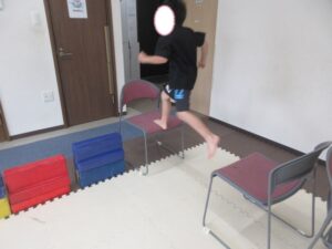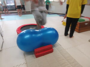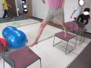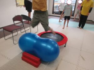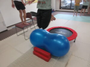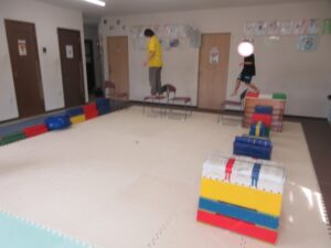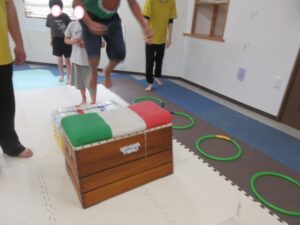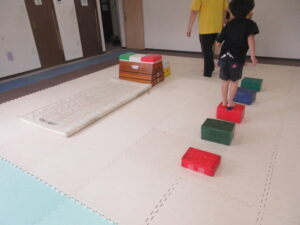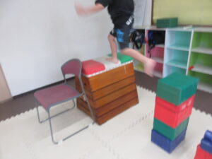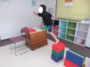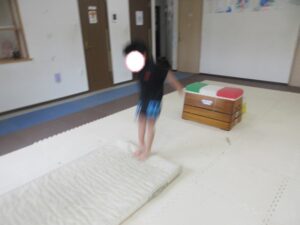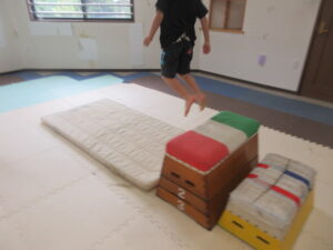 こちらのコースのお友達は、跳び箱に乗って、次の跳び箱へグージャンプで乗り、