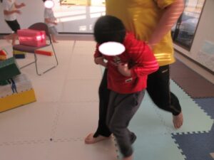 みんなニコニコで走り、音が止まると難しい所へ乗ろうと頑張るお友達が、