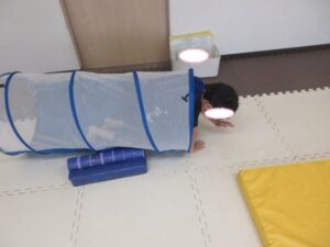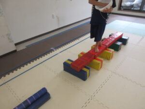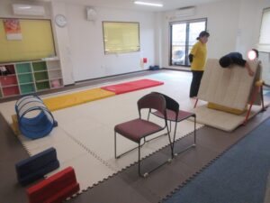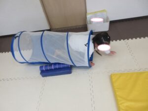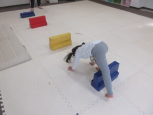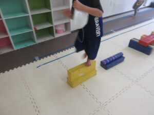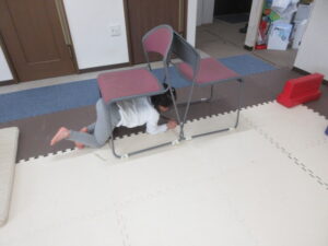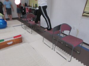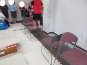 鉄棒上り下り→椅子のトンネル潜り→平均台を跨いで進む→トンネル潜り→