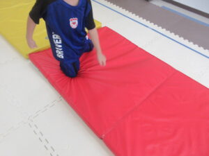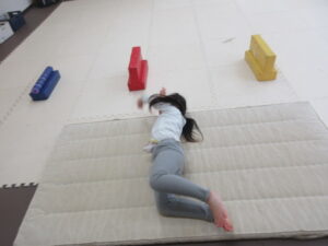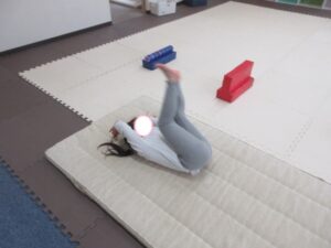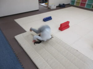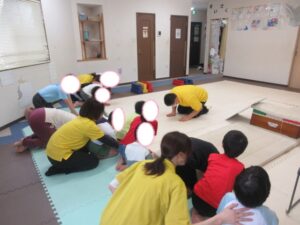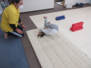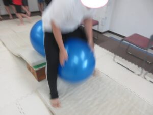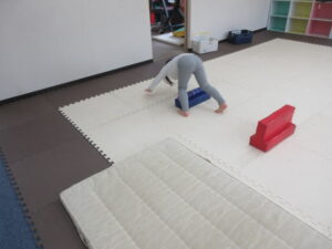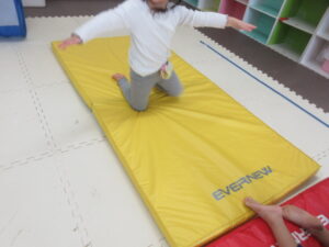 前転は頭と手をしっかりついて、お芋は手足ぴーーんと伸ばし、大玉は、先生から転がった