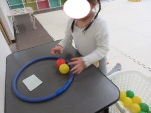 走って机まで進み、フープの中の数字カードと同じ数のボールを置いて走って戻ろう💨