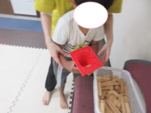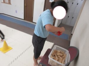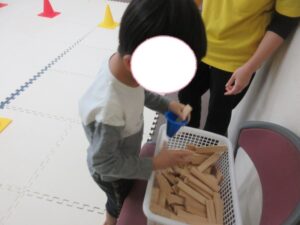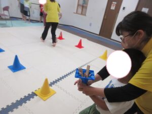 赤・青2つのチームに分かれて木のブロックをコーンに詰めたら
