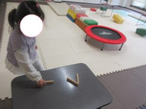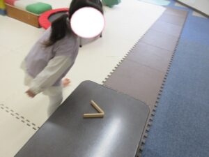 平均台の上を走ったら、木の板(カプラ)をとってテーブルに立てよう!