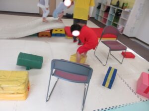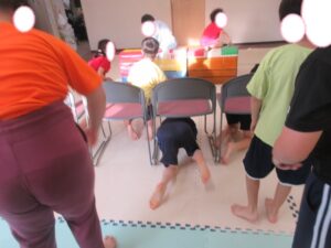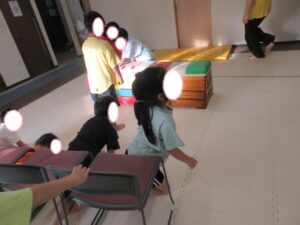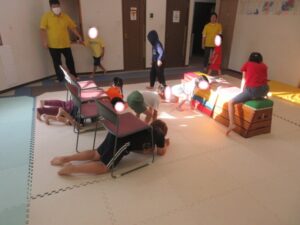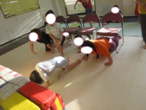 椅子の下をくぐり、跳び箱を越えて教室の反対側まで行こう!