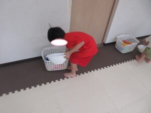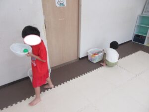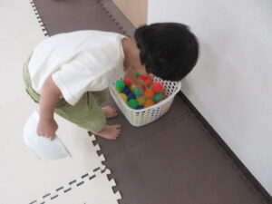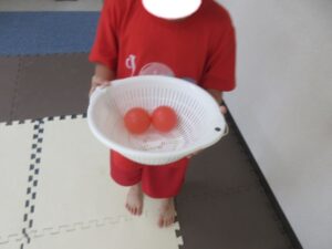先生の声を聞いて、指定されたボールの色と個数をかごに入れて持ち帰ろう!
