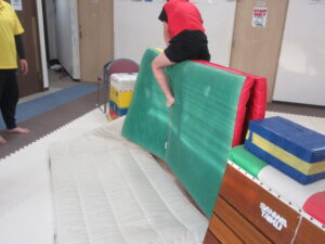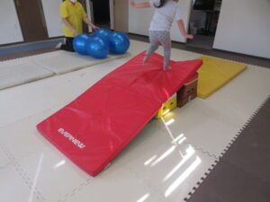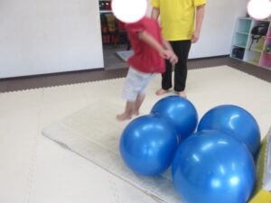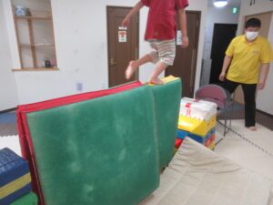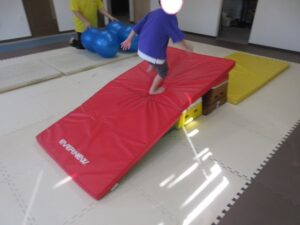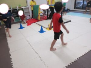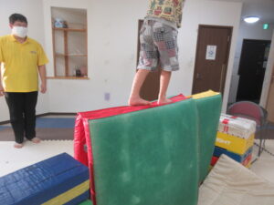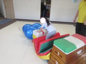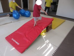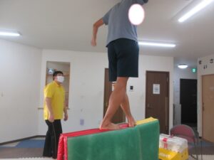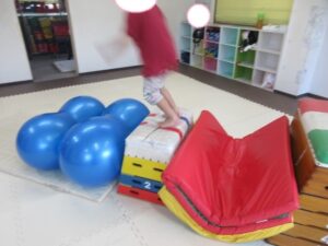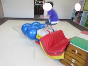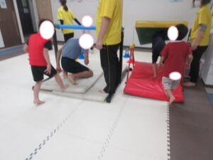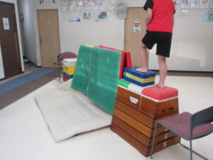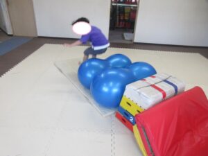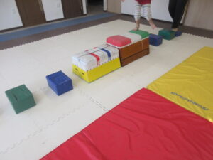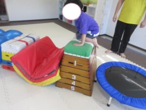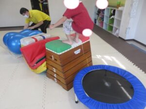 トランポリン→跳び箱→跳び箱→ピーナッツボールの順で