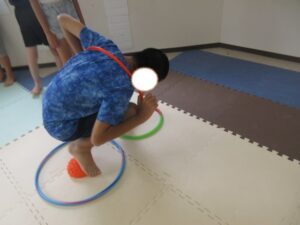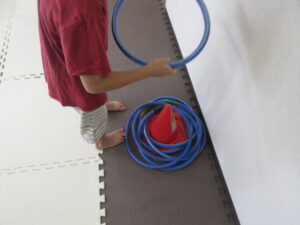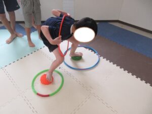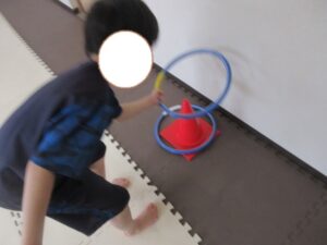 フープを下から通して頭から抜いたら走ってコーンに入れて