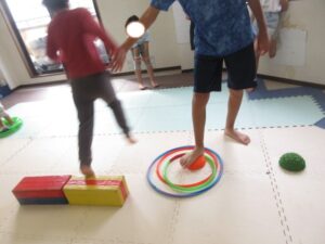 こちらのチームはプニプニの上に乗ってバランスをとりながら