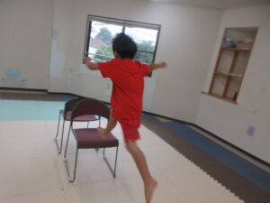 椅子の間がドンドン離れても、しっかり助走をつけて、足を伸ばして