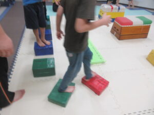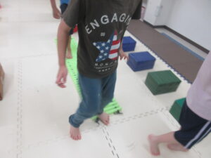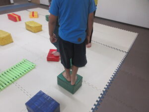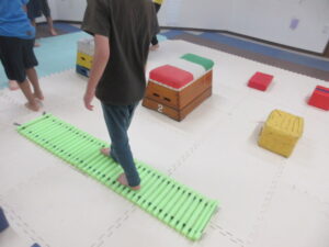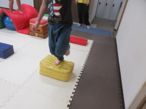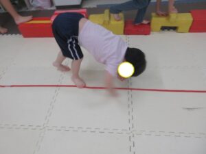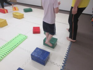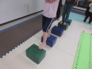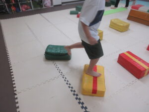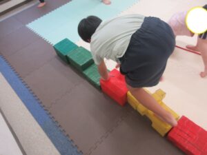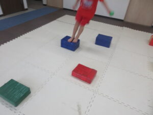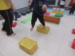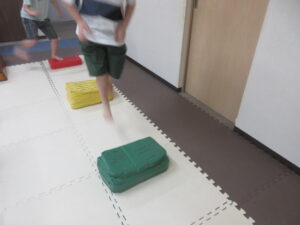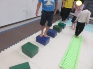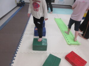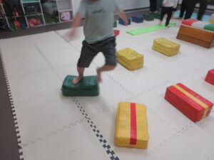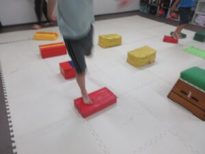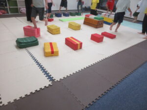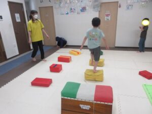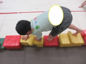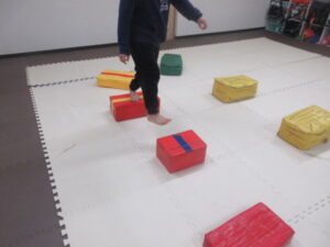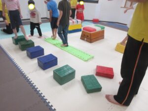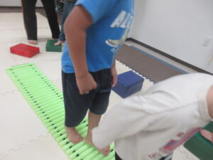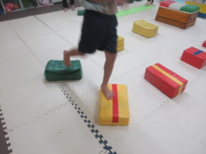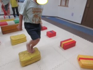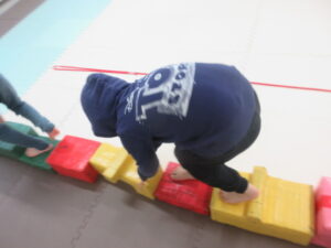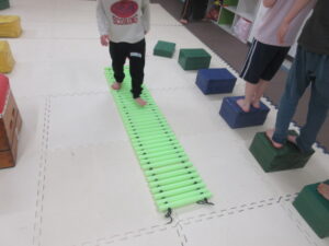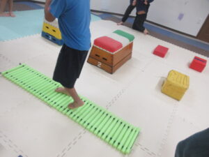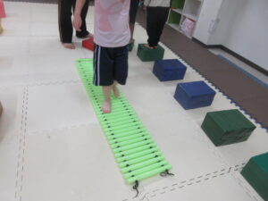 ジグザグに置いてある平均台の上を、走って進もう!!