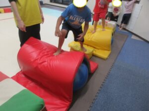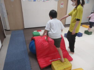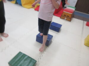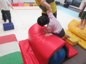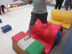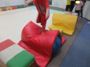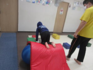 バランスボールで足元ふらふら👣だけど、踏ん張って歩いて進んでね!!