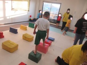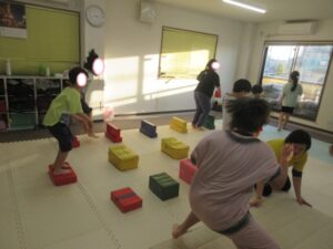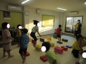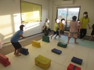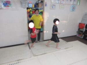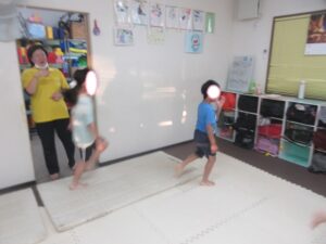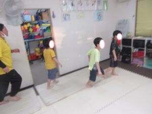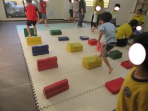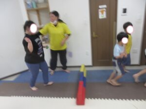 帰りは、島ジャンプ・ハードルジャンプ・難しいお友達は、平均台の上を歩いて