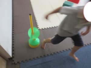 一本橋を走って反対側の棒にカラーコーンを通したら、走って戻ってきてねε≡≡ヘ( ´Д`)ノ