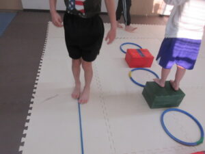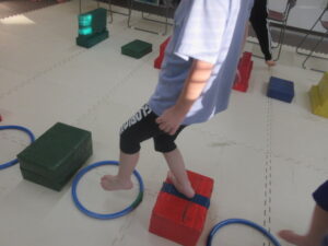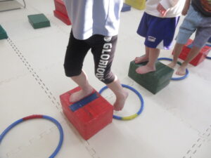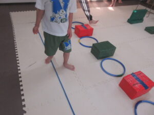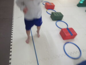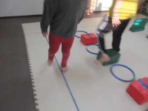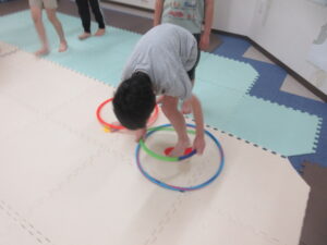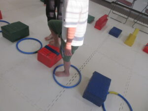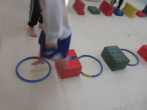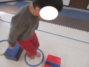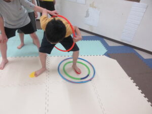 こちらのコースのお友達は、足跡に合わせてフープに立つよ👣