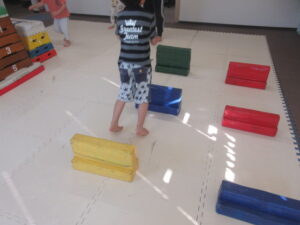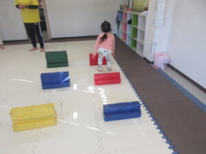 スタートでボールを1つ持ってボールと同じ色の平均台に乗って進もう(*^-^*)