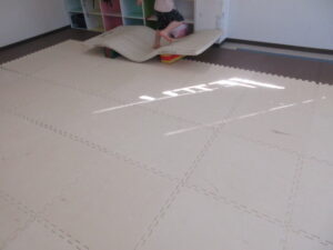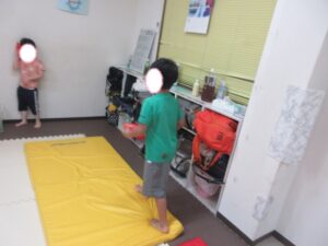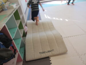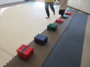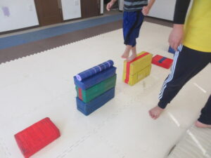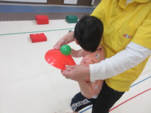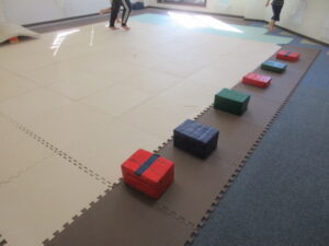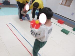 こちらのコースのお友達はコーンを持ってマットの上を走ろう!