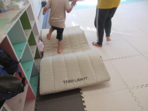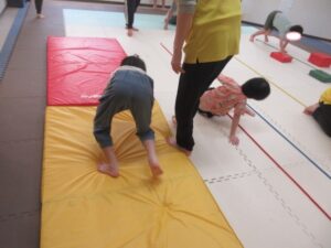 ロープの上に手足を乗せたクマさん・やわらかいマットの上を進むクマさんを頑張りました!