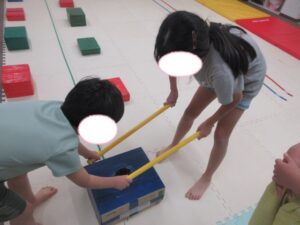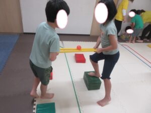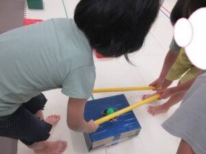 お友達と二つの棒をうまく使ってボールを運ぼう!