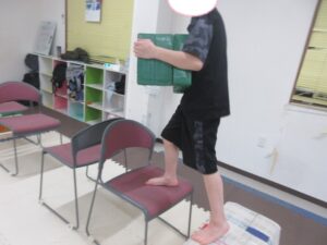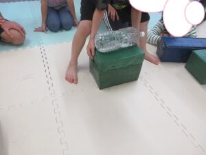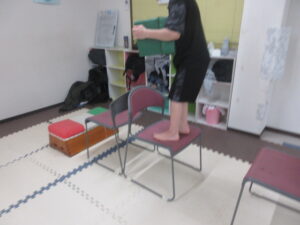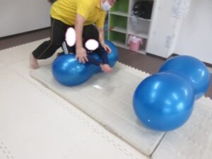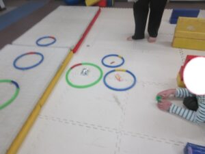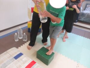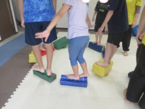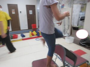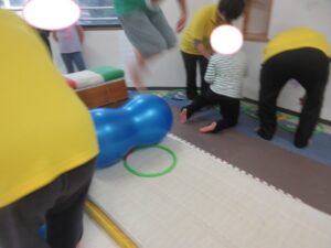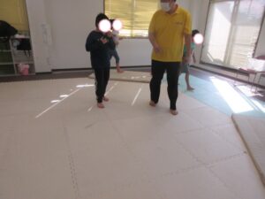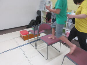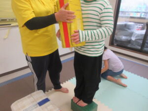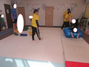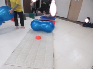 音楽が鳴っている間は平均台の上を歩いてグルグルしよう!