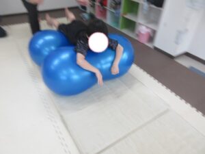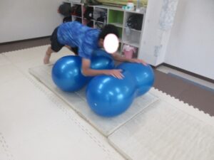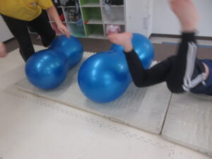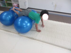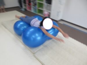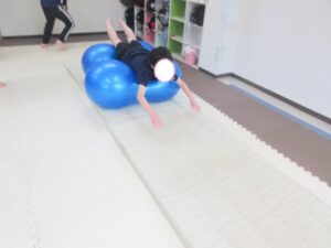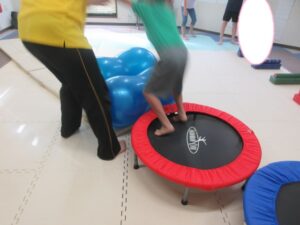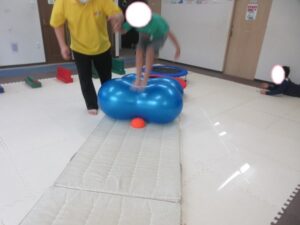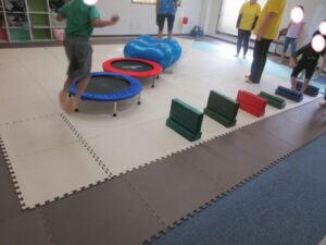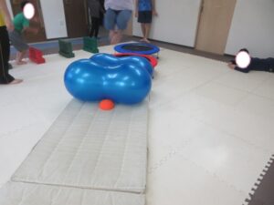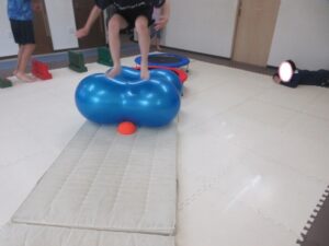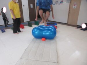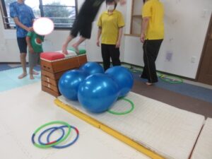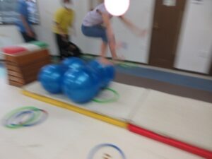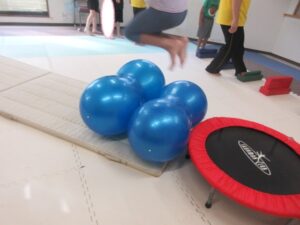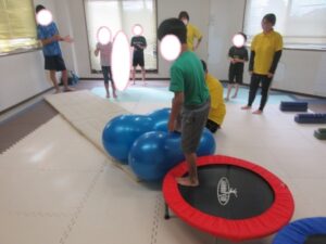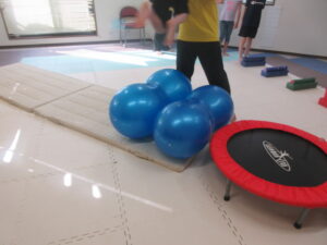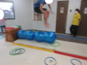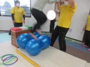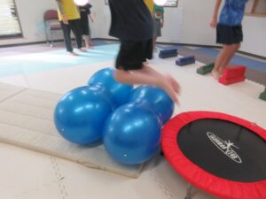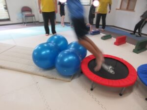 次はトランポリンで勢いをつけてバランスボールを飛び越えるよ!