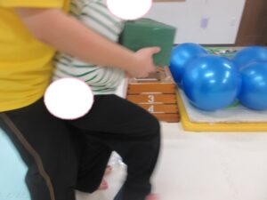 先生に注目!出された色に乗っていたお友達はバラスボールに乗ってダイブー!