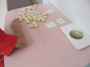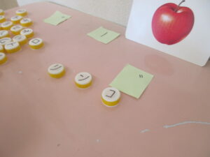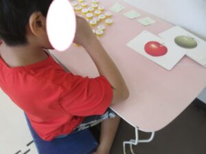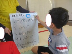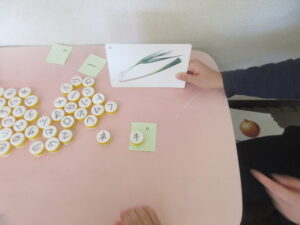 マットの上を走ったら食べ物カードに書かれた食べ物の名前を
