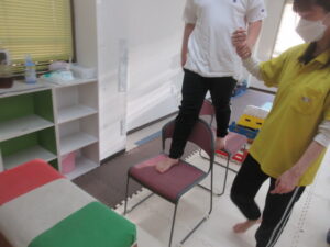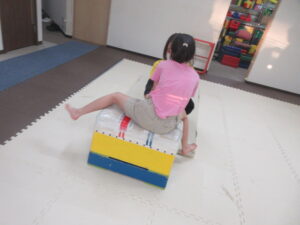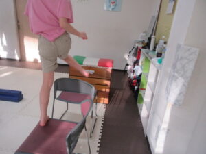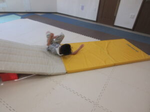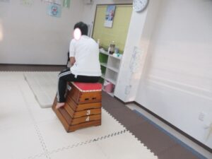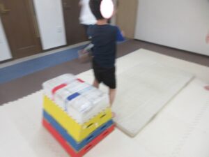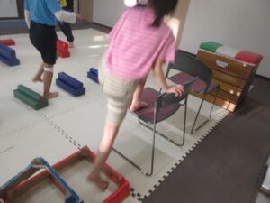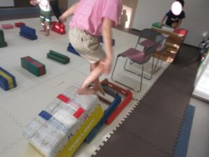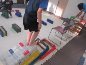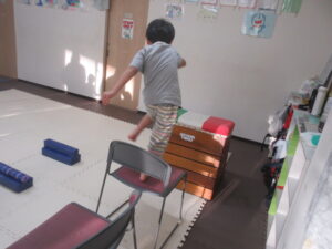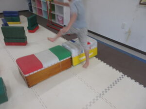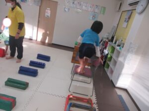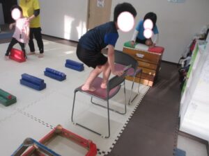 こっちのコースは跳び箱の上から段を跨いで椅子に乗り、最後は跳び箱から後ろ向きで降りよう!
