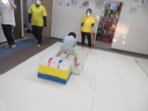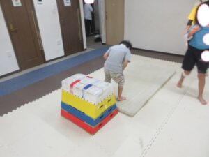 跳び箱を越えよう!まだジャンプが難しいお友達は、よじ登って進みました♪