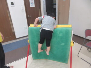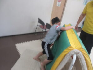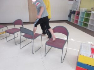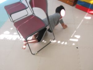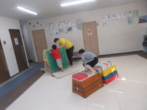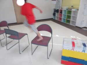 椅子の下を潜って、跳び箱に乗って降りて、、、→最後は鉄棒の山を上り下り