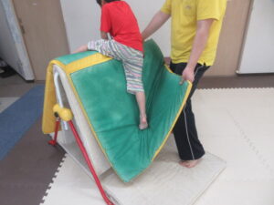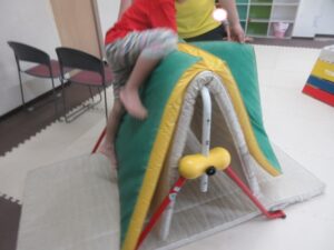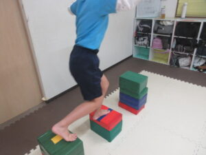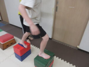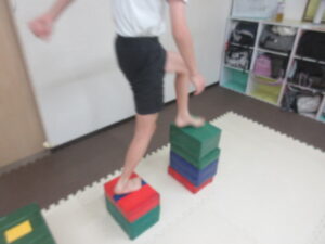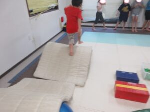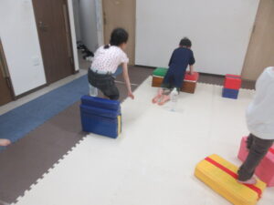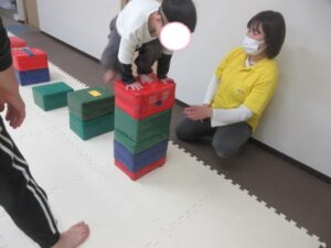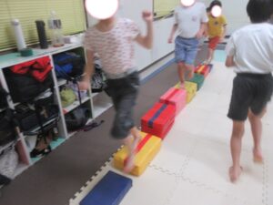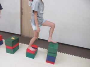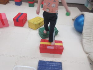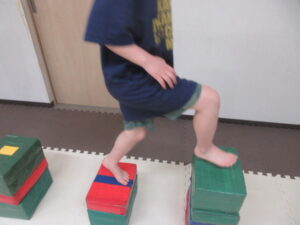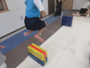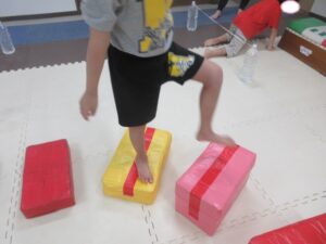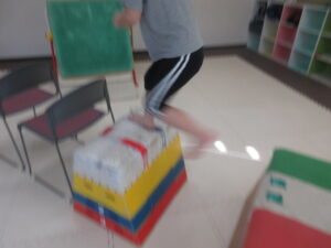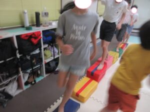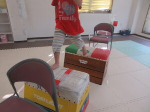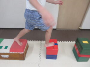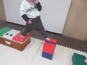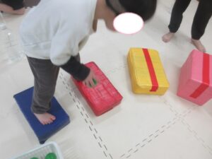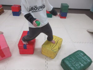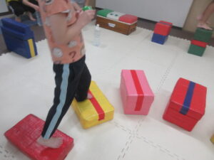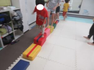 跳び箱に乗ったら、平均台の凸凹道を落ちない様に歩いて進み、