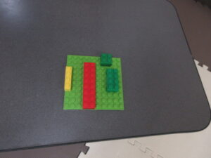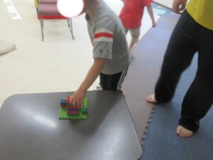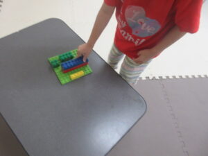 机の上に置いてあるブロックと、同じ形を見つけて、重ねてきてね(^^♪