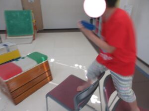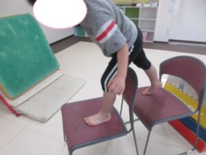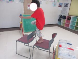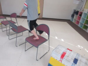 椅子の上などバランス歩きをして反対側まで進んだら、持っているブロックと