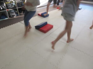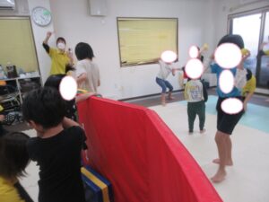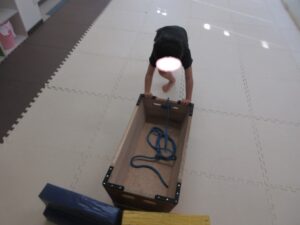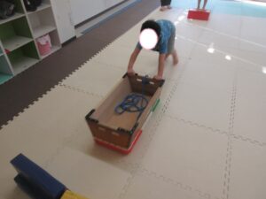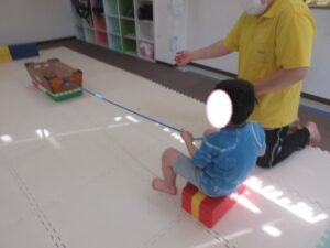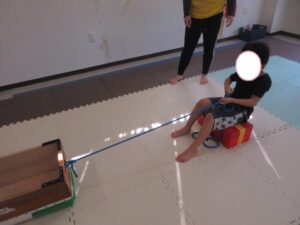 赤い平均台に座って、跳び箱をロープで、自分の前まで引っ張ろう!!