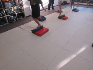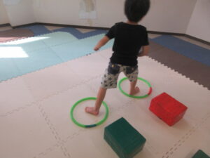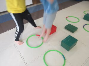 反対側まで進んだら、フープと平均台の置いてある形に合わせて、
