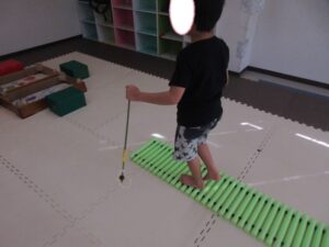 釣れた魚はカゴに入れて、かごの紐を持って平均台の上をバランス歩き👣