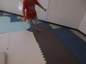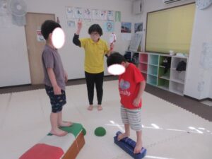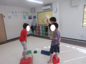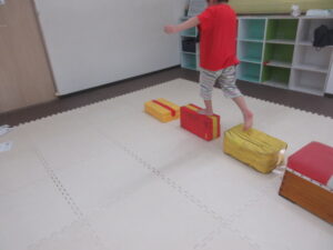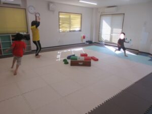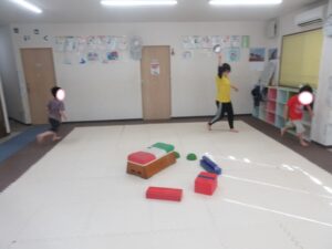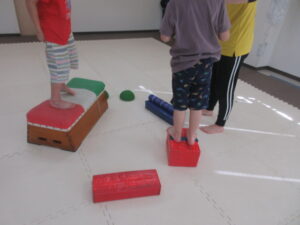 音が止まったら、平均台や跳び箱の上に乗って止まる👣