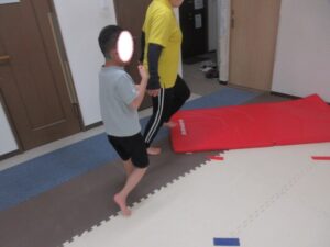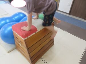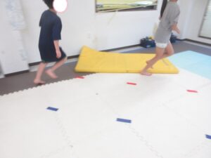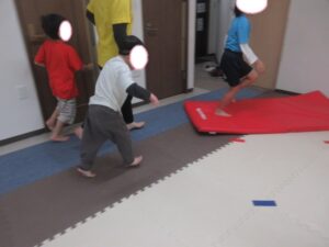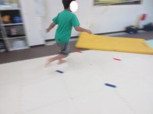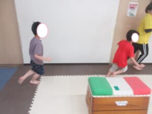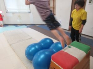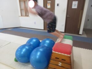 反対側まで進んだら、跳び箱に乗ってマットへ大ジャンプしよう(^^)/